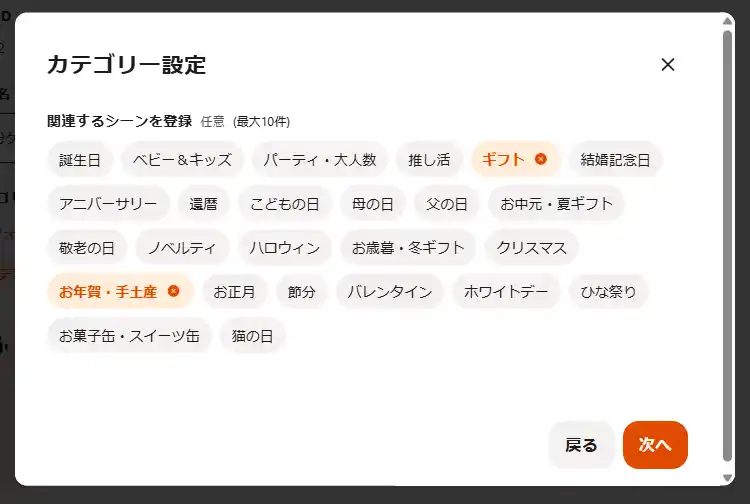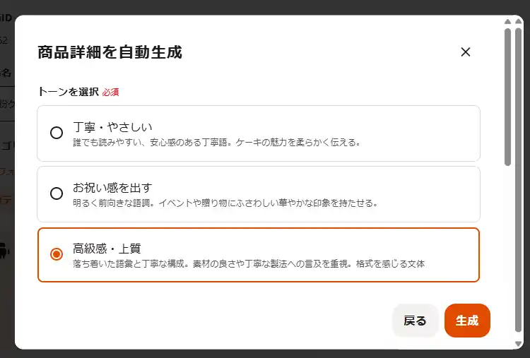 ブランドに合わせたトーン選択 「丁寧・やさしい」「お祝い感を出す」「高級感・上質」といった3種類のトーンから選択可能。店舗の世界観に沿った商品ページを作成できます。 |
