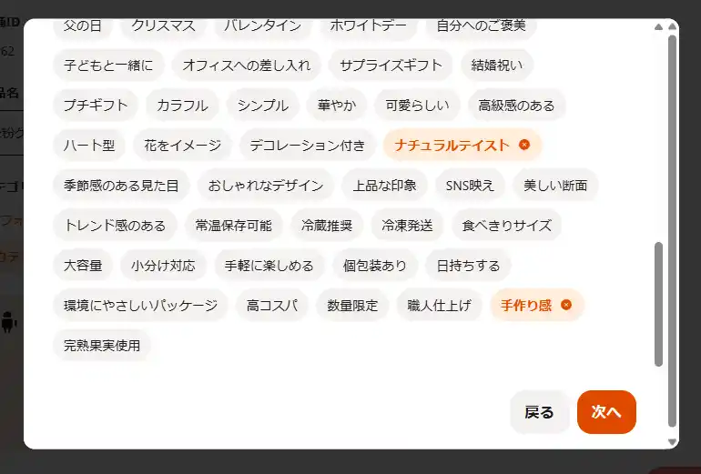 ワンクリックで商品紹介文を自動生成 商品名やカテゴリー、利用シーン(誕生日・クリスマスなど)、キーワードを選択するだけで、数十秒以内にAIが文章を生成します |