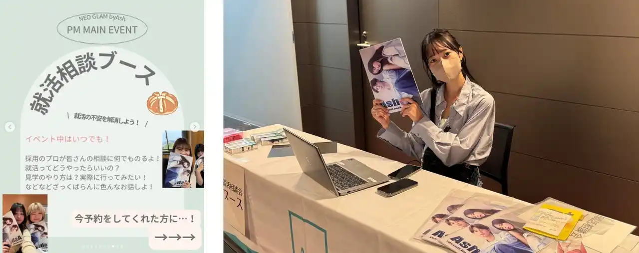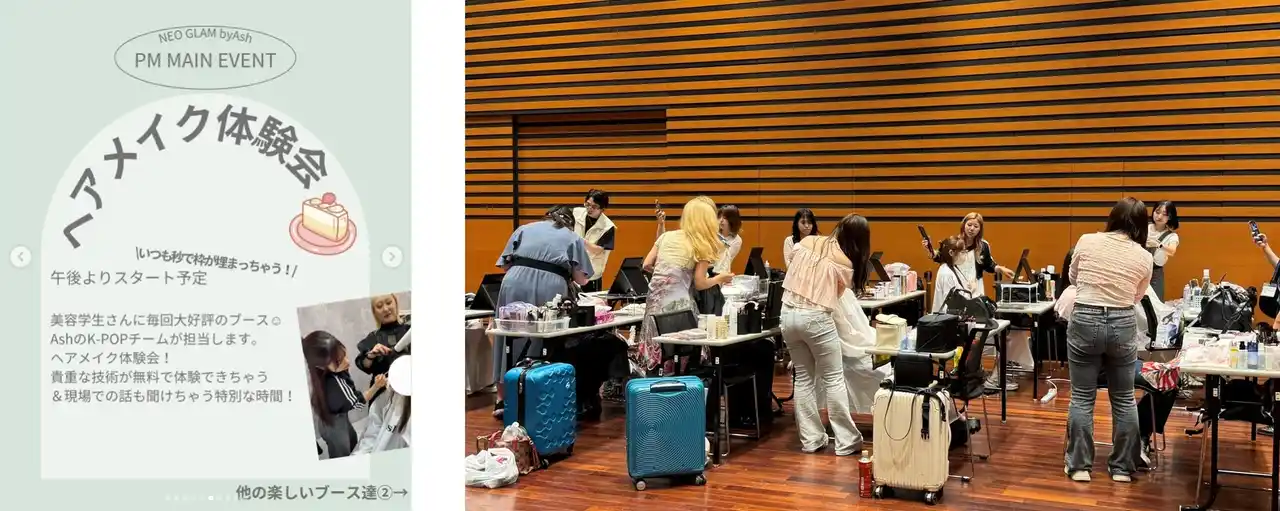 本イベントは、“美容が好き”という気持ちと“自分らしさ”を大切にしたい学生を応援するキャリアイベントです。業界の第一線で活躍する韓国トップスタイリストによるデモンストレーション、K-POPアーティストのヘアメイクを手がけるAshスタッフによる施術体験、人気インフルエンサーによるフリーマーケットなど、多彩なコンテンツを通じて、楽しみながらも将来考える機会を提供しました。Ashの採用担当者によるブースは一日を通して開設され、学生からは「気軽に相談できた」との声も寄せられました。 |