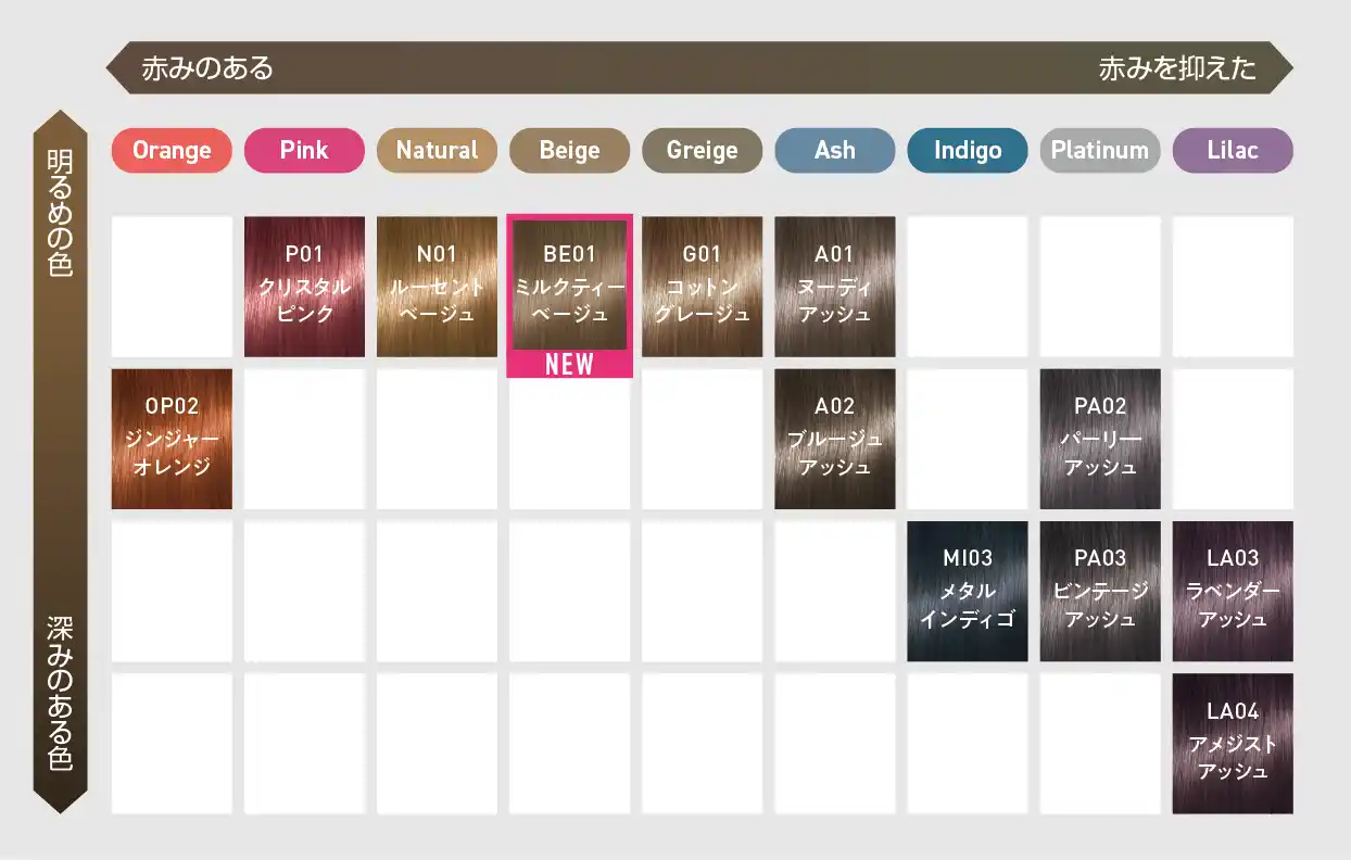今回登場する「ミルクティーベージュ」は、やわらかな透明感が魅力のベージュ系カラー。近年サロンでも定番人気となっている明るめのミルクティーカラーで、軽やかで洗練された印象を演出します。 |