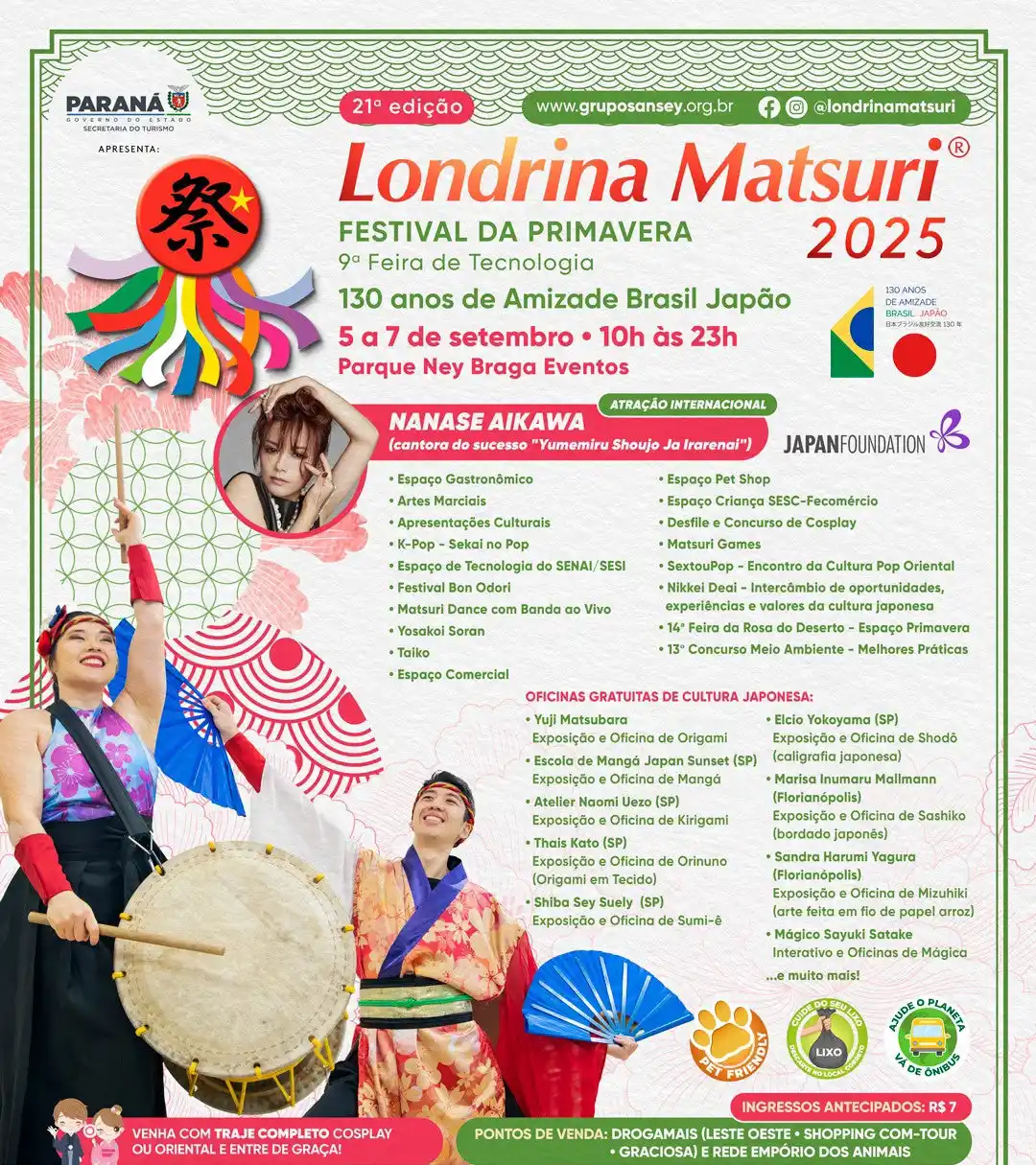 株式会社大創産業(広島県東広島市 代表取締役社長:矢野靖二、以下「大創産業」)は、歌手・相川七瀬さんが出演する、日本とブラジルの文化をつなぐ国際交流イベント「Londrina Matsuri 2025」(開催日:2025年9月6日(土)から8日(月)、場所:ブラジル・ロンドリーナ)に賛同します。現地のDAISO 2店舗(Catuai Shopping Londrina店、Praça da Liberdade店)に相川七瀬さんをお招きし、お客様との交流の場を創出します。9月6日(土)には、Instagramアカウントでインスタライブを配信予定です。 |