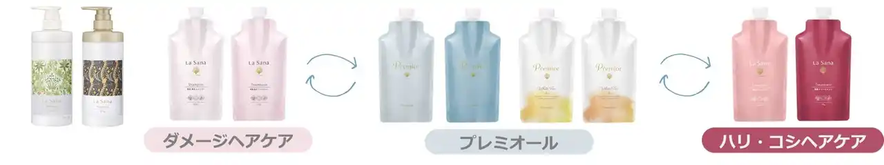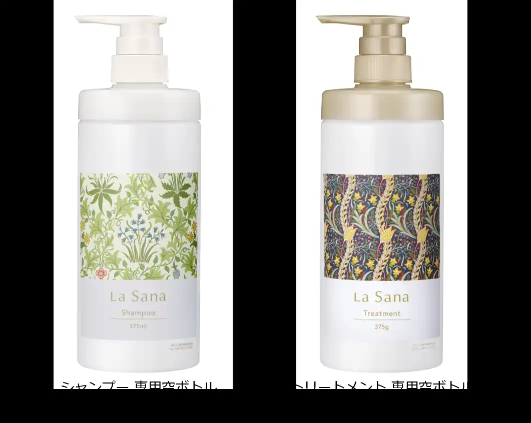 | ラサーナの全ヘアケアシリーズ共通のシャンプー375ml・トリートメント375gの専用空ボトルは、1本持っているだけで、年齢や季節によって変わる髪や頭皮のお悩みに合わせて他のシリーズへスイッチしやすい設計です。 | |||||||