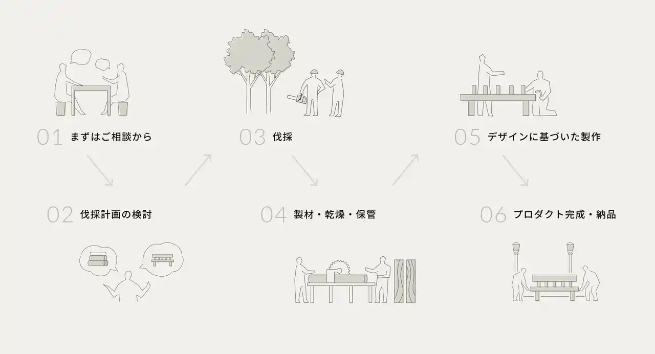 伐採の背景や敷地条件、つくりたいプロダクトや開発コンセプトを丁寧に伺い、最適な伐採木の活用計画を立案します。将来の活用を見据えて設計意図を反映した伐採を行い、その後は製材・乾燥・保管まで一貫して管理。さらに設計者やデザイナーと密に連携し、オリジナルの内装や什器をオーダーメイドで製作することで、その土地に根ざした唯一無二のプロダクトを完成・納品します。 |