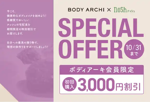 | 対象期間中にドクターズセルフエステ【BODY ARCHI】にご入会いただいた方には、通常の入会特典に加えて「nosh(ナッシュ)3,000円クーポン」をプレゼントいたします! | ||||||||||||||