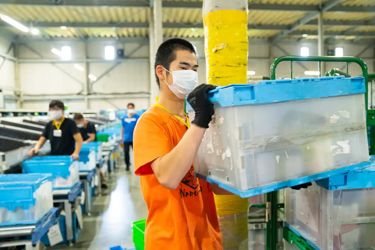 KEIPE株式会社の物流事業で働く様子。障害者スタッフが複数名でチームを組み、業務発注先の企業で働く。 |