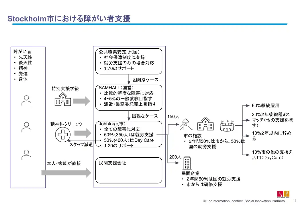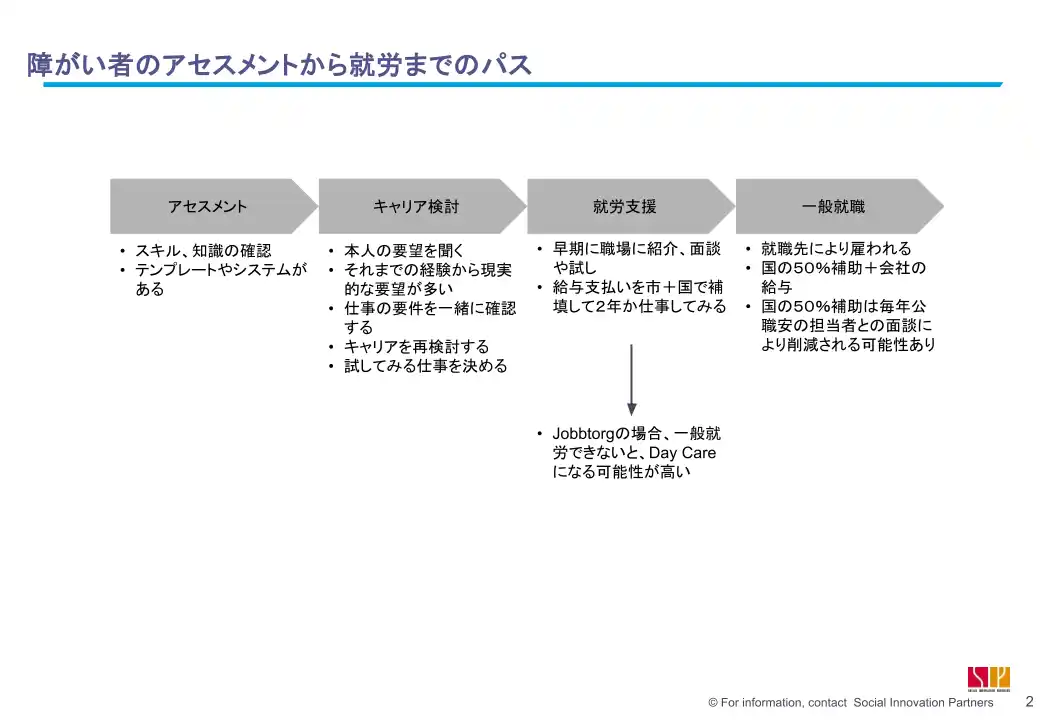 スウェーデンの場合、就職が決まると、最初の2年間は国と市が給与の50%ずつを補助します。つまり、企業は障害者スタッフの給与を負担しません。2年後には企業と国で50%ずつ負担します。 |