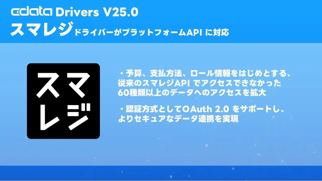 本アップデートより、スマレジドライバーがプラットフォームAPI に対応しました。予算、支払方法、ロール情報をはじめとする、従来のスマレジAPI でアクセスできなかった60種類以上のデータへのアクセスを拡大。スマレジデータを各種ツール・アプリに連携することで、予実管理などの用途におけるデータ活用が可能になります。また、認証方式としてOAuth 2.0 をサポートし、よりセキュアなデータ連携を実現しています。 |