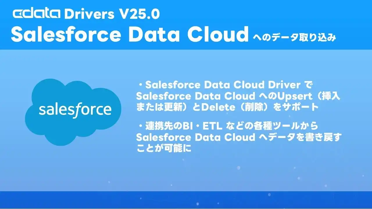 Salesforce Data Cloud は、企業が持つすべてのデータをSalesforce Platform 上に集約、統合するカスタマーデータプラットフォームです。本アップデートでは、Salesforce Data Cloud Driver でUpsert(挿入または更新)とDelete(削除)がサポートされました。連携先のETL などのツールからSalesforce Data Cloud へデータを書き戻すことが可能になり、多様なサービスから顧客関連のデータを集約・統合することが可能になります。 |