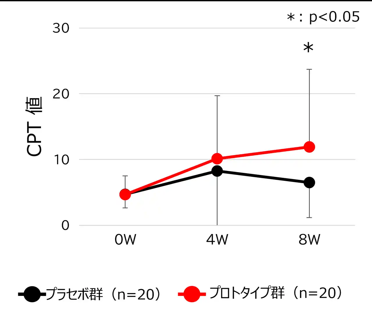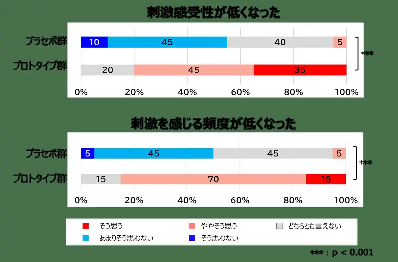 さらに、敏感肌意識があり、刺激感受性が高い20~40代の女性40名*3を対象に、γ-アミノ-β-ヒドロキシ酪酸を含むプロトタイプ製剤を8週間使用する群20名と、含まないプラセボ製剤を使用する群20名に分けて、連用試験を実施しました。その結果、プラセボ製剤と比較して、プロトタイプ製剤を連用した群では、連用8週間後に刺激を感じる最小の電気レベル(CPT値)が有意に高くなりました(図5)。また、試験終了後のアンケートでは、プラセボ製剤と比較してプロトタイプ製剤を連用した群では、日常生活におけるチクチク・ヒリヒリなどの不快感が軽減したと感じた人の割合が有意に高いという結果が得られました(図6)。 |
