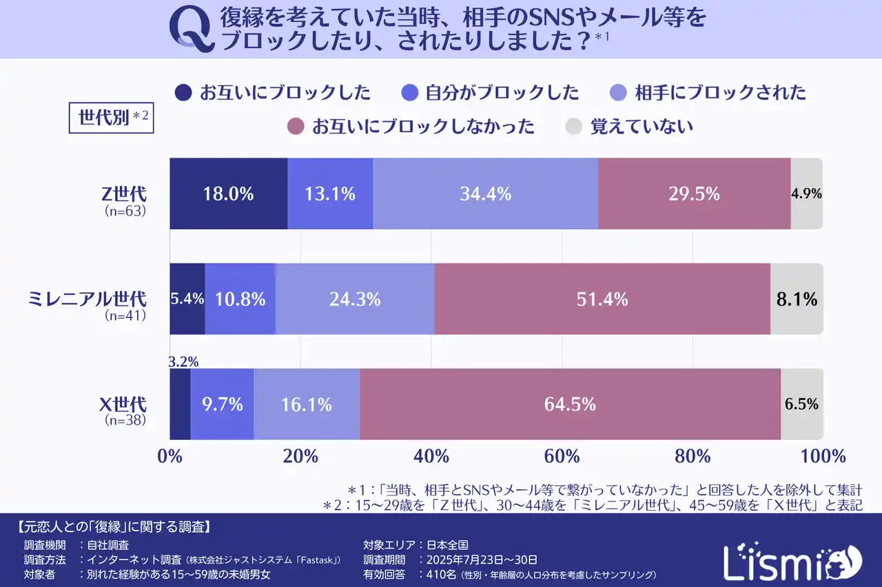 復縁のタイミングが重要であることがわかりましたが、現代の恋愛ではSNSでの関係性も復縁に影響を与えているのでしょうか。復縁に向けて行動を起こした人を対象に、復縁を考えていた当時にSNSやメールでブロックした経験があるかを質問したところ、多くの人が何らかのブロック経験を持っており、世代によってブロックの仕方に違いがあることがわかりました。 |