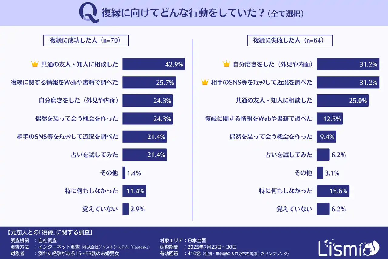 復縁を考える際のデジタル行動の特徴が見えてきましたが、実際に復縁を成功させた人はどのような行動を取っていたのでしょうか。復縁に向けて行動を起こした人を対象に、当時どのような取り組みをしていたかを質問したところ、成功者と失敗者の間で行動パターンに違いがあることがわかりました。 |