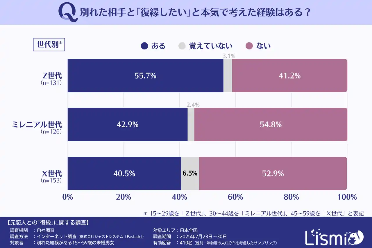 1.復縁願望はZ世代で55.7%、年上世代より約15ポイント高い |