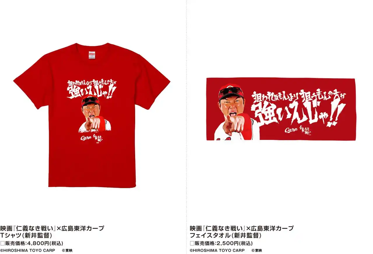 新井監督の力強い表情と、映画『仁義なき戦い』の名セリフの入ったTシャツとタオルをラインナップ。 |