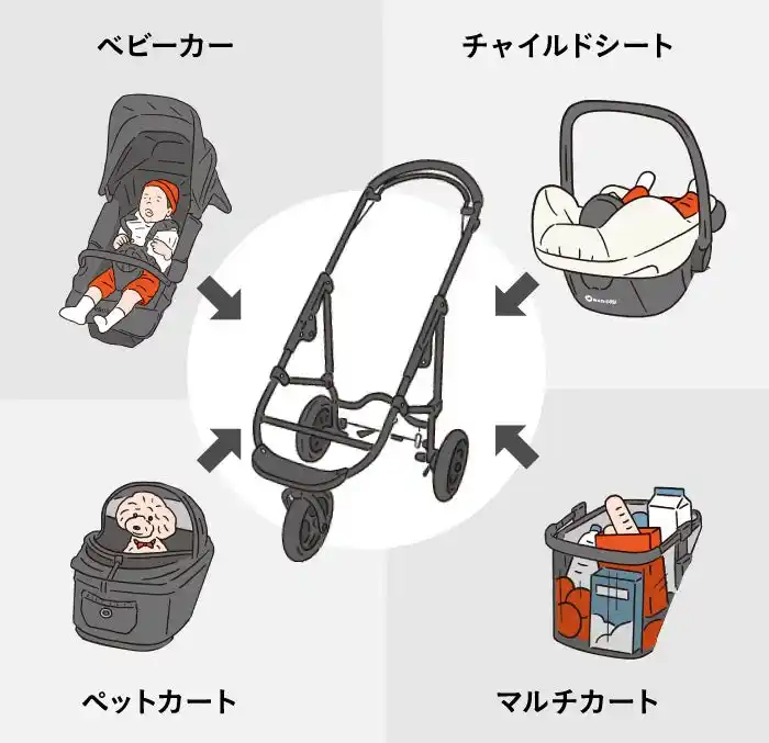 | エアバギーのフレームは、上部の「ユニット」を付け替えることで、ベビーカーからペットカート、マルチカートへと自在に変化します。工具不要で誰でも簡単に着脱でき、ライフスタイルの変化にも柔軟に対応可能です。 | ||||||||||
