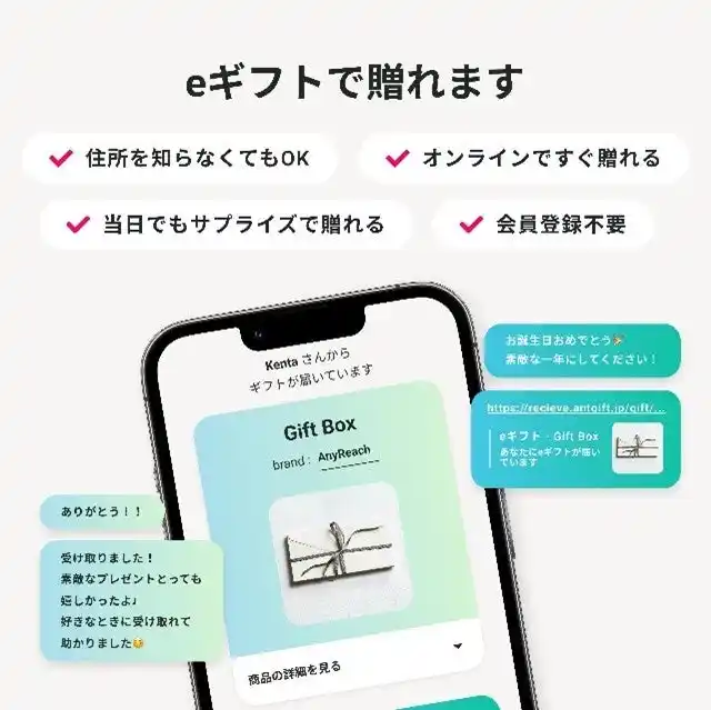 購入後に発行されるURLを送り、相手が受け取り住所を入力することで、購入した商品がギフトとして届きます。 |