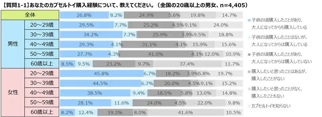 当社が2025年1月~2月に実施したインターネットアンケート調査では、20代・30代女性の2人に1人以上が、大人になってからカプセルトイを購入したことがある、ということが明らかになりました。さらに、すべての年代で男性よりも女性の方が大人になってからカプセルトイを購入している人の割合が高いことが明らかになりました。 |