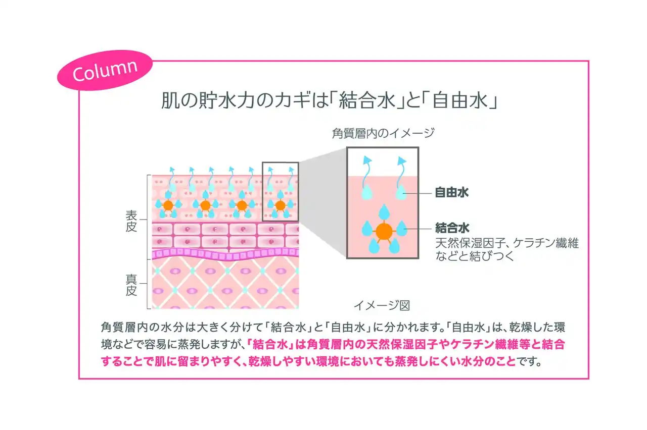 例えば洗顔後につっぱりを感じやすいのは、洗顔によって一時的に肌へ水分が供給されるものの、角質層内に留まることのない「自由水」が容易に蒸発してしまうためです。一方、角質細胞に含まれる天然保湿因子などと結びつく水である「結合水」は、角質層に安定して保持されやすいのです。「結合水」の量が増えると、うるおいの持続実感につながると考えられます。 |