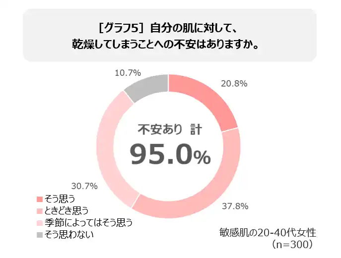 また、自分の肌に対して、乾燥してしまうことへの不安はありますか、という質問に対して「不安あり」と回答をした敏感肌の人は9割以上(95.0%)に及びました[グラフ5]。 |