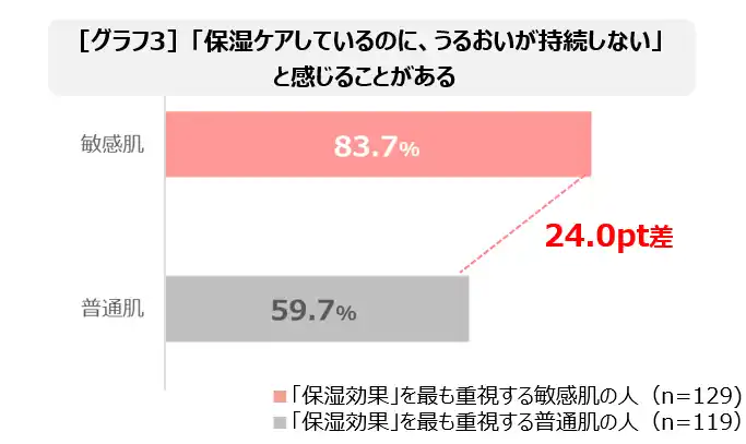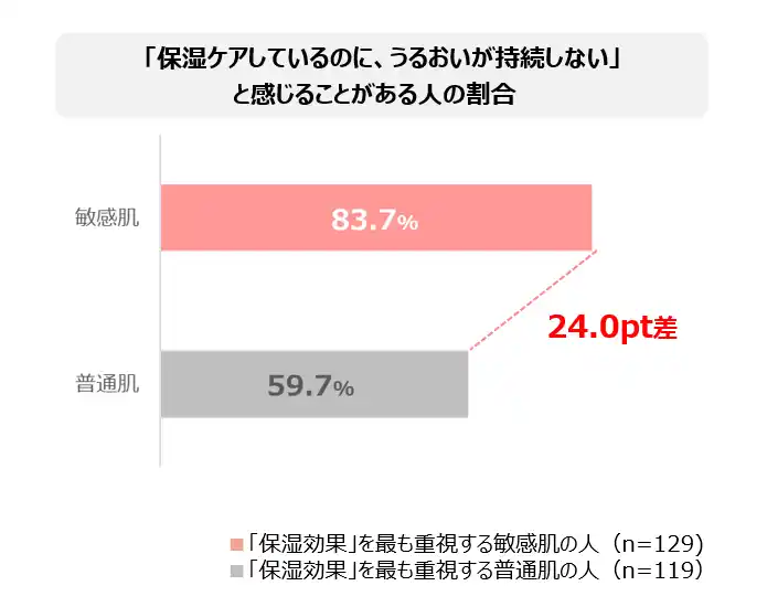 ・一方で普通肌の人の回答は59.7%。敏感肌の人の方が24.0ptも高く、スキンケアに保湿効果を求めながらも、うるおいの持続を実感できていない人が敏感肌の人には特に多いという結果に。 |