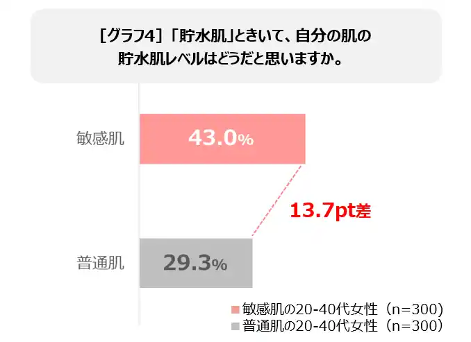 「貯水肌」ときいて、自分の肌の貯水肌レベルはどうだと思いますか、という質問に対して、敏感肌の人の4割以上(43.0%)が「貯水肌レベルは低いと思う」と回答し、普通肌の人(29.3%)と比べると13.7ptも多いことがわかりました[グラフ4]。 |
