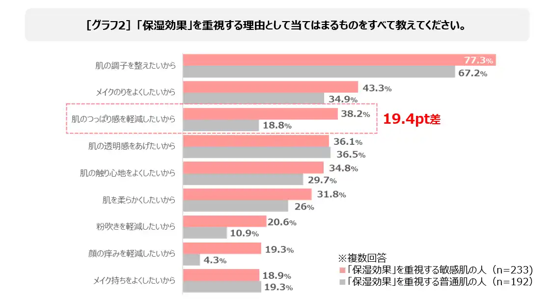 特に、敏感肌の人が保湿効果を重視する理由として、3位の「肌のつっぱり感を軽減したいから」(38.2%)は、普通肌の人と比べると差が19.4ptで最も大きく、敏感肌独自の悩みがみえた結果となりました。 |