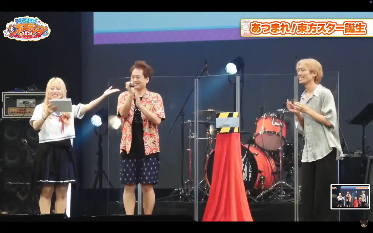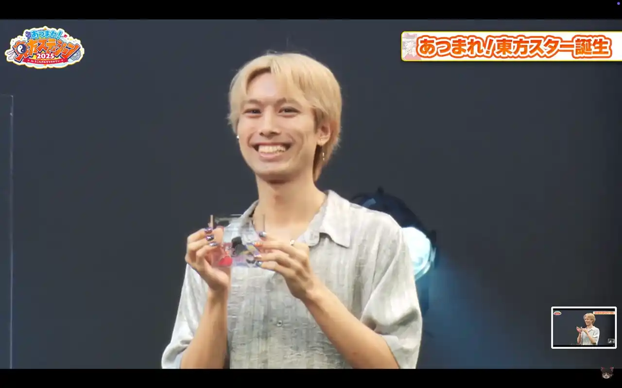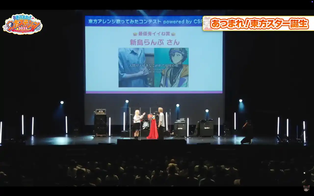| 本企画はCSP利用中のクリエイターを対象にカラオケ@DAMの東方アレンジ楽曲を歌唱して投稿するコンテストで、CSP最優秀イイね!賞に「新島らんぷ」さんが歌唱した「人間が大好きなこわれた妖怪の唄」の動画(https://youtu.be/IuIVejLlw0Q?si=hINHFxH6BivhsAeq )が選ばれ、「あつまれ!東方ステーション2025」のステージに出演、投稿した楽曲の歌唱披露と、記念盾が授与がされました。 | |||||||||||||||