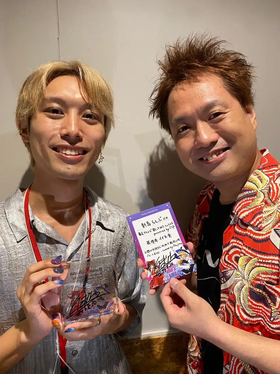 | そこに、ステージ袖でこっそり聞いていた本家のビートまりおさんがサプライズで登場。「表現力とか、ファルセットとかめちゃくちゃ上手いですね!作った当初から表現力や感情が大事な曲だと思っていて、今回の歌唱は感情が乗っていて良かったです。歌ってくれてありがとうございました!」と大絶賛。そして記念品の盾をビートまりおさんから直々に授与され、新島さんは満面の笑みで応えました。この様子は、YouTubeとニコニコで生配信されました。 | |||||||||||||||