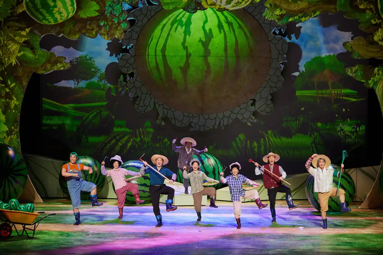 日本でも出版されているアンニョン・タルの絵本「すいかのプール」(岩波書店、訳:斎藤真理子)をミュージカル化。田舎町に現れた巨大なすいかのプールを舞台に、温かい家族愛と純粋な空想の世界を描いた作品で、目の前で巨大なすいかが割れて、空を飛ぶ雲屋さんの愉快なフライングショーが幅広い観客層の五感を楽しませる人気作です。 |