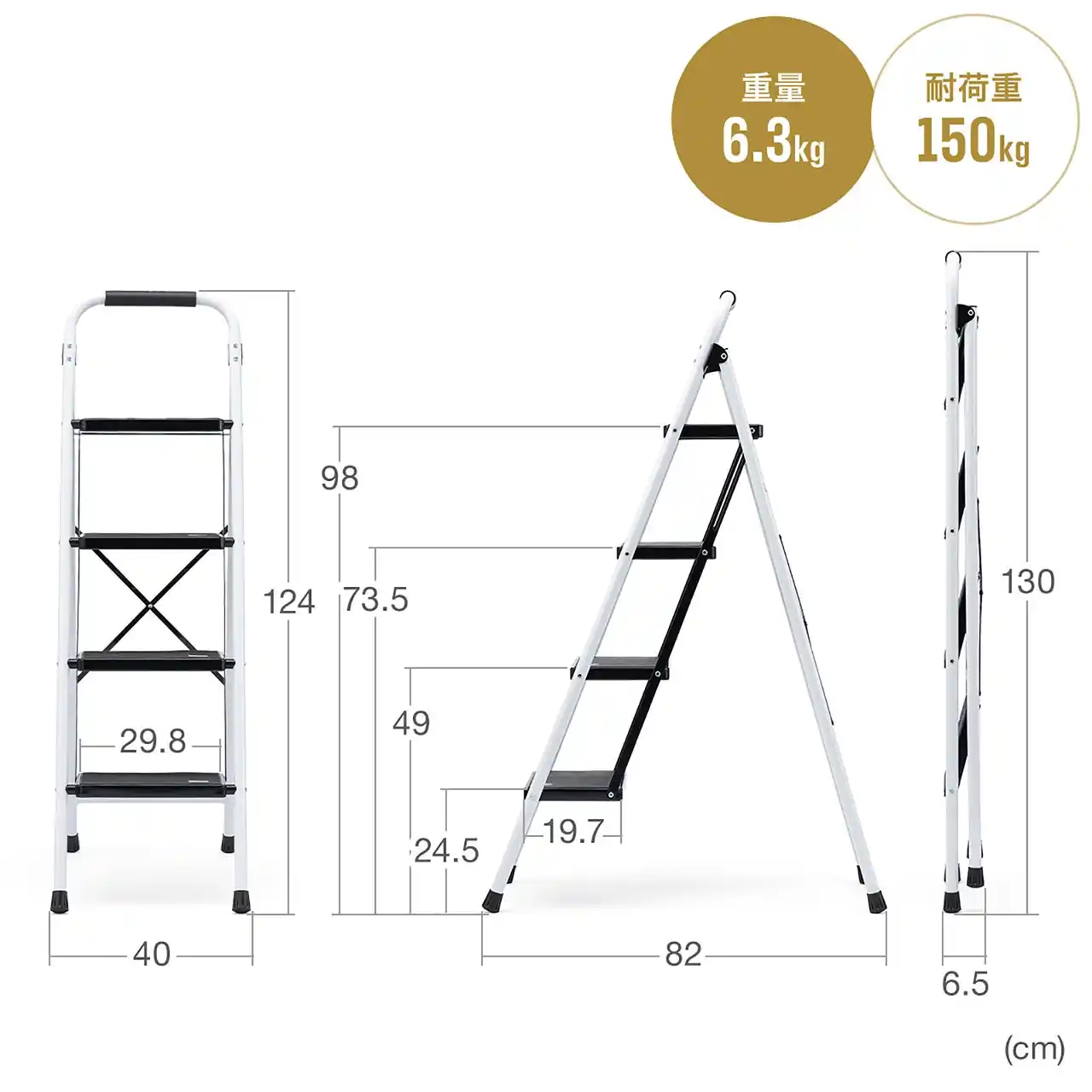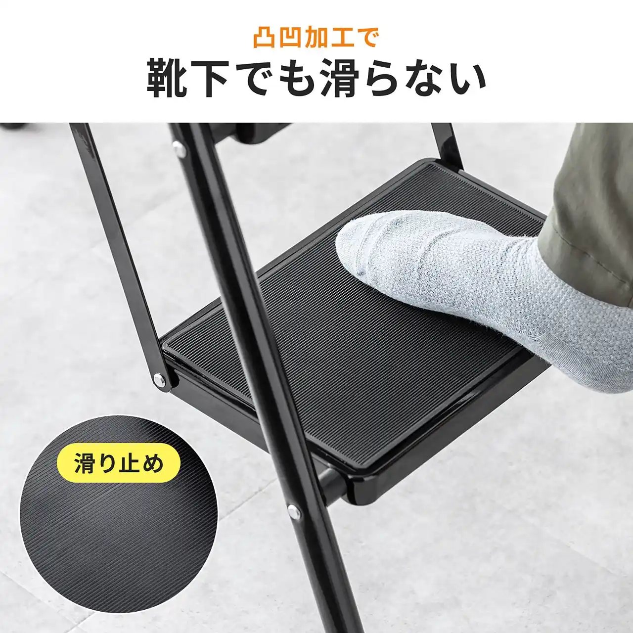 | 大きめのステップに滑り止めを施し、足元の安定感を確保しました。150kgまで耐荷重可能な頑丈なフレームにより、高所での作業も安心。さらに手すりが付いているので、昇降時にしっかりと体を支えられ、どなたでも安全に使用できます。 | |||||||||