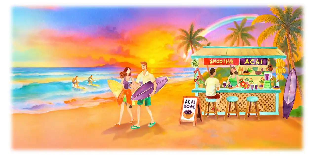 本品は、ハワイのレシピを参考にした、美と健康のサポートにおすすめの季節限定スムージーです。豊富な鉄分やポリフェノールを含む、スーパーフルーツ※「アサイー」を使用しています。本商品にも使用している「アサイー」は、ブラジル・アマゾンの赤道直下に育つヤシ科の植物で、強い日差しにさらされる過酷な環境下で育ち、自然の恵みを含んでいます。その特徴にいち早く注目したのが、ハワイのサーファーたちで、日々の健康のために取り入れられてきたアサイーは、今では多くの人に支持されています。本品では、たっぷりの鉄分、ポリフェノール、食物繊維を含み、おいしくカラダを整えてくれます。 |