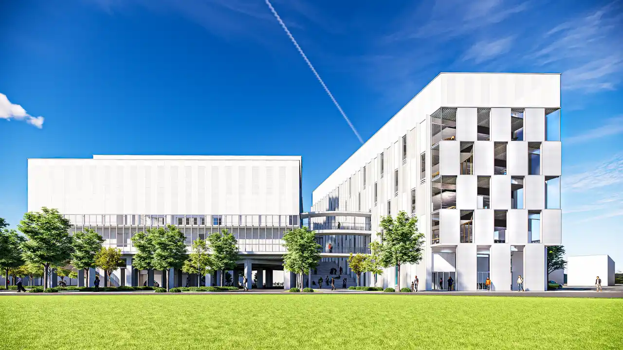 新学部棟「デジタル創生館(仮称)」(画像右)には最新機材を完備した実習室、研究室、工作実験室、植物工場や企業との共同研究室などが設けられています。 |