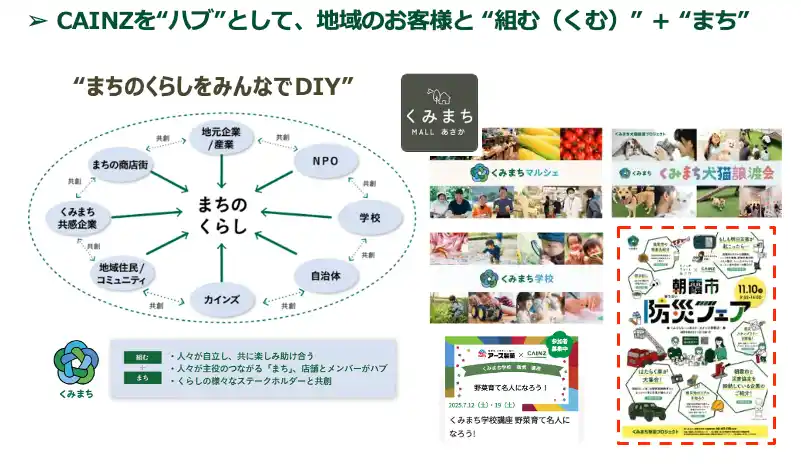 | カインズの額賀氏と小林氏より、同社が注力する地域共創プロジェクト「くみまち構想」が紹介されました。「くみまち」は単なる地域密着の枠を超え、町と一体となって“くらしをDIYする”という思想のもと展開されており、店舗を中心にしたコミュニティづくりを推進しています。また、小林氏からは、「年間1億4,477万人(2024年1月~12月) の来店がある中、物流最適化が今後の鍵」とし、「より多くの外部パートナーと協業し、課題をともに解決していきたい」という想いを語られました。 | |||