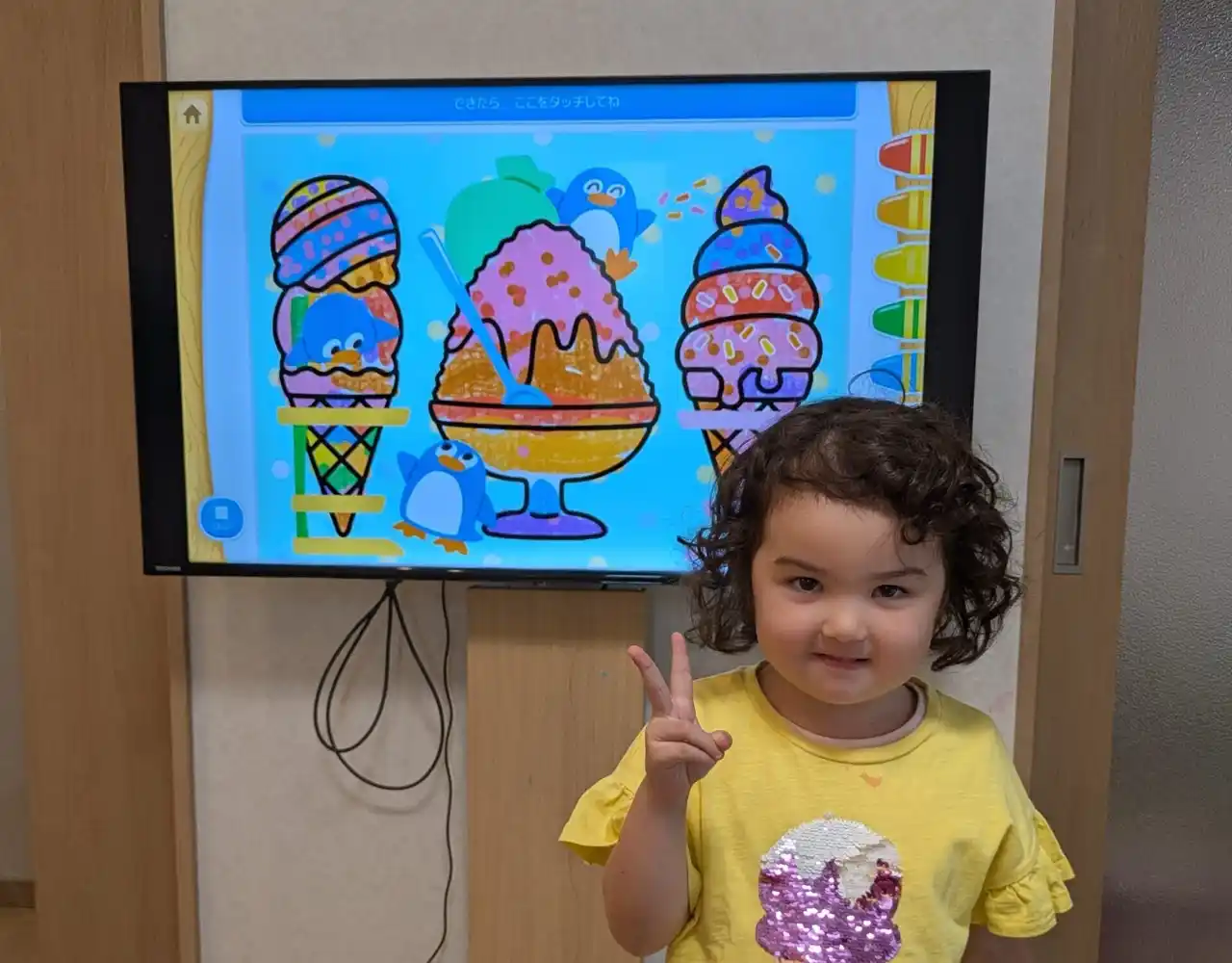 「ぬりえ」してテレビ前でピース |