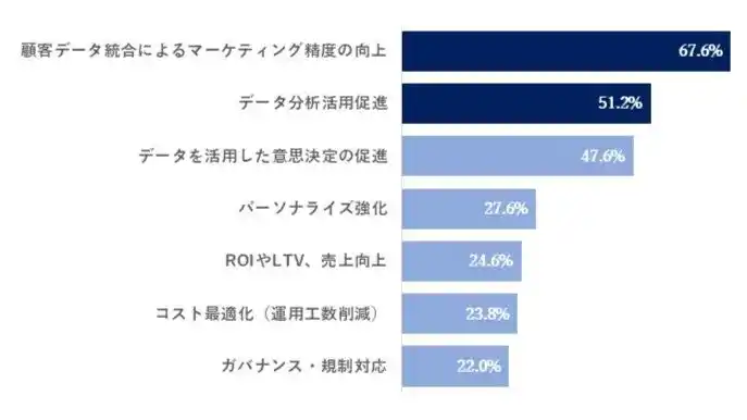 CDP導入の主な目的として最も多かったのは、「顧客データ統合によるマーケティング精度の向上」(67.5%)、次いで「データ分析活用促進」(51.2%)、「データを活用した意思決定の促進」(47.6%)でした。 |