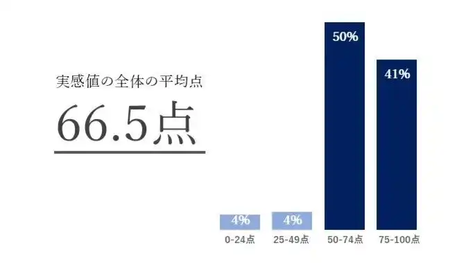 得点分布を見ると、「50~74点」が50%、「75~100点」が41%と、あわせて91%が導入効果の実感値を50点以上と評価しています。一方、「25~49点」「0~24点」という回答もそれぞれ4%あり、評価が分かれる“二極化”の傾向もみられました。 |