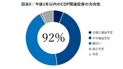 今後1年以内のCDP関連投資について、回答者の92%が「大幅に増加予定」、「やや増加予定」、「横ばい」と回答しました。この結果から、大半の企業が投資を継続、あるいはさらに拡大していく計画であることが明らかになりました。 |