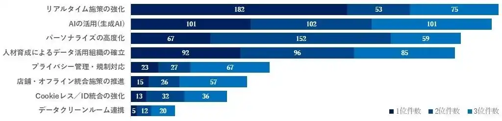 今後注力したいCDP活用領域の優先順位をたずねたところ、最も注力したい優先順位1位は、「リアルタイム施策の強化」(182件)が最も多く、次いで「AIの活用(生成AI)」(101件)、「人材育成によるデータ活用組織の確率」(92件)となりました。また、優先順位1位~3位の合計数で見ても、最も多かったのは「リアルタイム施策の強化」(310件)で、次いで「AIの活用(生成AI)」(304件)、「パーソナライズの高度化」(278件)となりました。 |