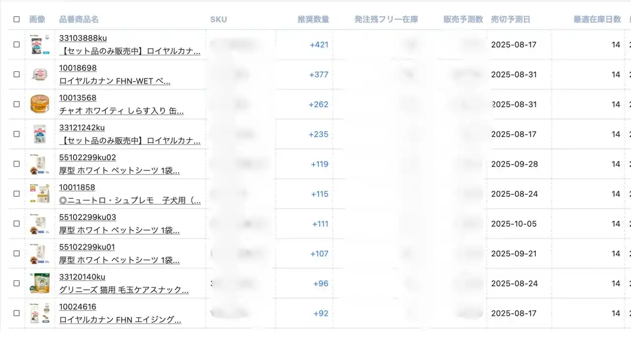 SKUごとの直近の販売数から販売予測を行い、現時点の在庫数と発注残の差分を推奨数量として表示するダッシュボードです。こちらのデータを見ながら発注数量を決定することで、Excelでの作業時間はゼロになりながら欠品を従来の10分の1に抑えていただけるようになりました。 |