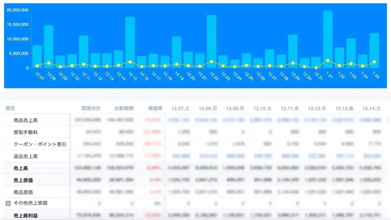 日次の売上、売上総利益、販売管理費から訪問者数、販売数、CVR、客単価、平均OFF率といった各種KPIの指定期間との比較が可能な限界利益のダッシュボードで日々の施策の効果検証を行っていただいております。ストアレコード導入前はExcelでの手作業で時間をかけて毎日集計していたものが、導入により毎朝一番にご確認いただけるようになりました。 |