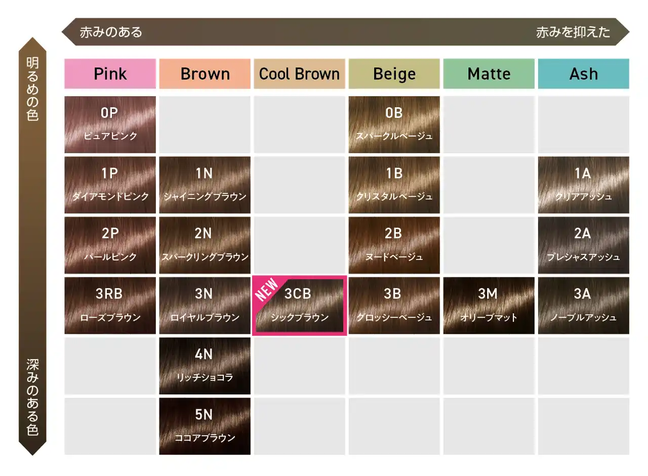 新色「シックブラウン」は、赤みを抑えた上品で深みのあるブラウンカラーです。「白髪染めは赤みが気になる」「ブラウンにしたいけれど赤っぽくなるのは避けたい」といった声に応え、落ち着きと洗練を感じさせるクールトーンに仕上げました。赤みの少ないブラウンは、髪の印象を引き締めながら、肌の色を自然に引き立ててくれます。 |