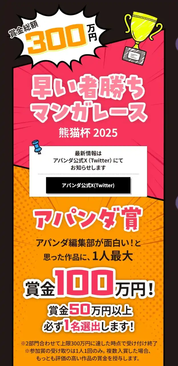 参加賞・賞金については、アパンダの公式X(Twitter)アカウント(@WebComic_APANTA)よりDMにてお知らせいたします。 |
