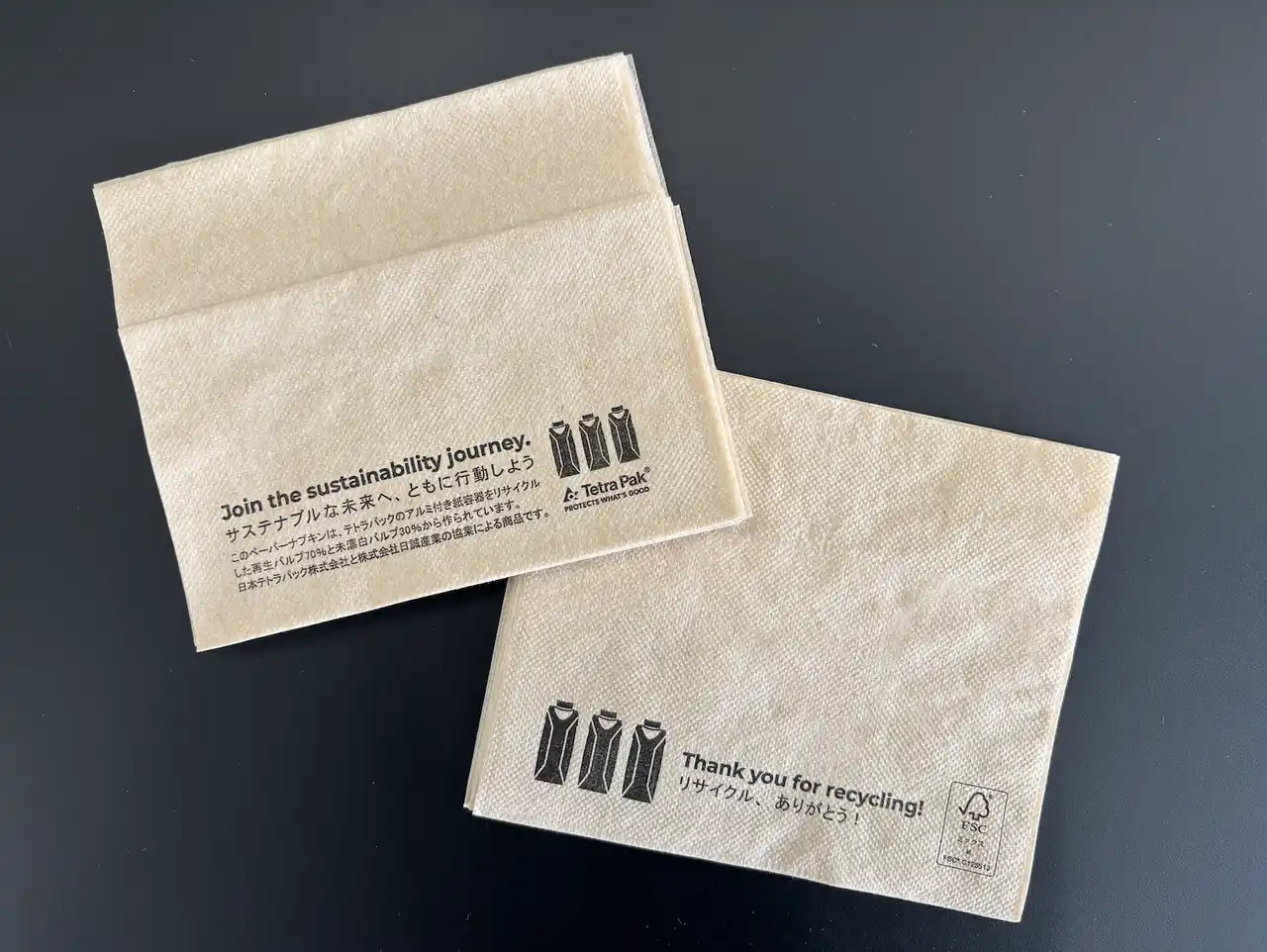 テトラパックの紙パックを一部原料として使用したオリジナルデザインのペーパーナプキンは、北欧パビリオン内で開催された同社の特別イベント開催時にノベルティとして配布されました。また、同社の来客スペースや工場内の社員食堂で使用されているほか、消費者イベントのノベルティとしても好評です。今後さまざまな場面での活用が期待されています。 |