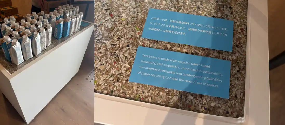 北欧パビリオンで配布されているボトルドウォーターを置くテーブルには、天面に再生ボードが使用されています。このボードは、テトラパックの紙容器を含む紙製の容器や化粧箱などをリサイクルして作られたもので、紙容器の繊維を固めた板状の素材です。耐久性・風合い・汎用性に優れており、机やディスプレイシェルフなど、さまざまな用途で活用されています。 |