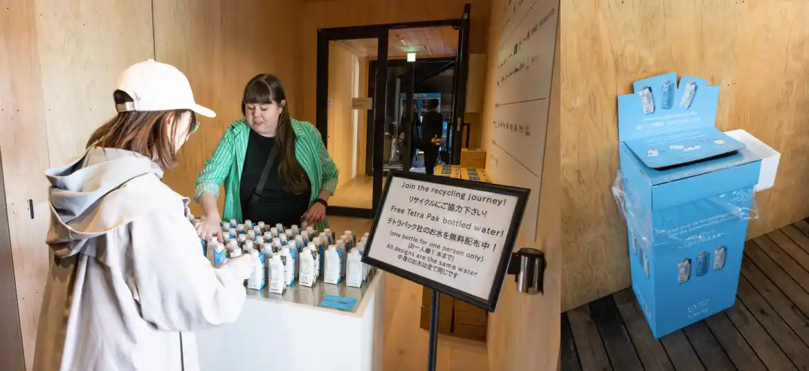 こうした課題に対し、日本テトラパックは、来場者が紙容器入りのボトルドウォーターを手に取り、飲み終えた容器をパビリオン内の専用回収ボックスや、万博会場内の3Rステーションに設置された「紙ごみ」専用箱へ投函することで、飲用から回収、リサイクルまでの一連の流れを体験できる機会を提供します。 |