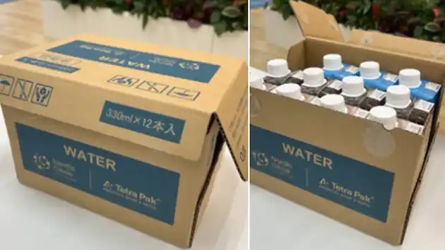 北欧パビリオンで配布されているボトルドウォーターの梱包には、テトラパックの紙容器(アルミ付き紙容器)を原料に使用した再生段ボールが採用されています。 |