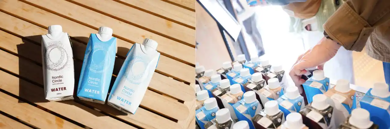 北欧パビリオンで配布されている紙容器入りのボトルドウォーター*は、アルミ箔層を含む多層構造で設計されており、光や酸素から内容物を守る高い機能性を備えています。牛乳パックと同様にリサイクルが可能である点も、大きな特徴のひとつです。 |