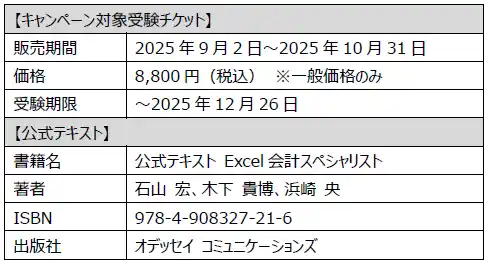 アオテンストアで『エクセル会計スペシャリスト』の受験チケットを購入された方を対象に、公式テキスト1冊を無料でプレゼントします。 |