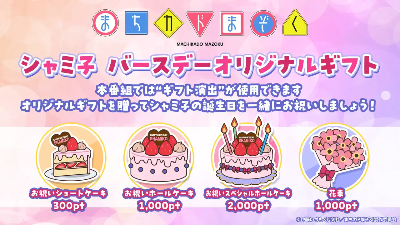 今年で5回目の開催となるシャミ子の誕生日を記念した一挙放送。2021年、2022年、2023年、2024年に開催された過去4回の誕生日記念の放送では、毎回10万件前後のお祝いコメントが寄せられるなど、大きな反響を呼んでいます。今回の一挙放送では、ニコニコのギフト機能を活用し、コメントに加えてオリジナル演出付きのギフトでシャミ子の誕生日をお祝いできます。 |