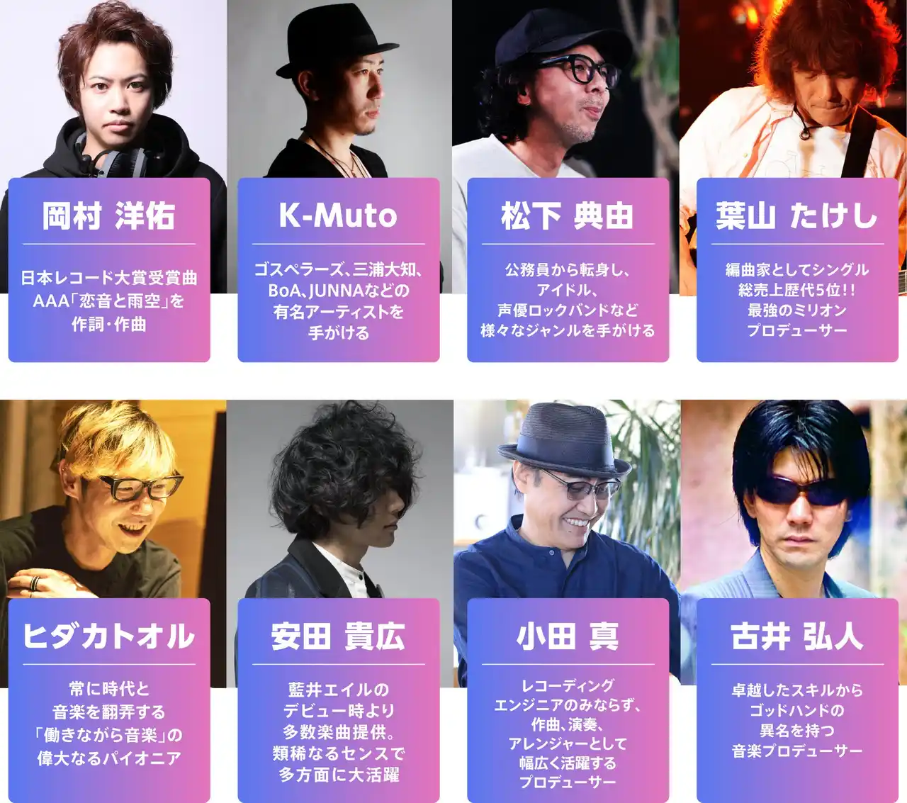 ミュージックプラネットの歌手オーディションでは、プロデューサーがあなたの歌声に個別でコメントします。また、プロジェクトを開始してからも面談やライブイベントなど、プロデューサーと関わる機会を設けています。参画しているプロデューサー陣を紹介します。 |