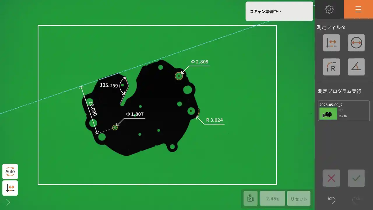 | 新開発の自動要素検出機能で、素早く簡単に測定手順を作成。ワークを置くだけで測定手順が自動再生し、位置や方向がラフに置かれたワークもすばやく形状認識・特定し、すぐに測定を実行します。 | ||||||||
